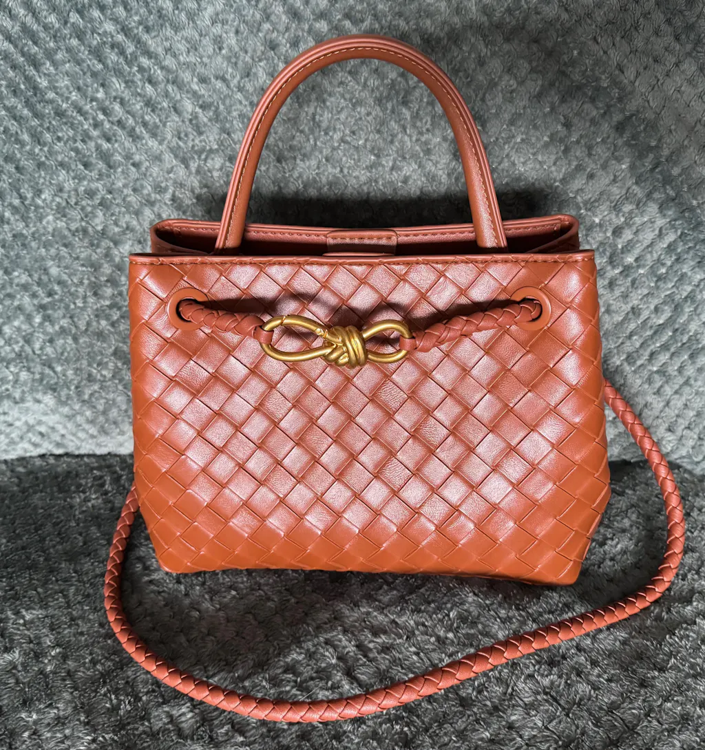 Let's DIY an on-the-go everyday carrying. We could find these standout features on the kit like intrecciato leather, the metal knot and a sliding braided strap, and with this strap you can secure and carry the bag differently. The top secures with magnets, opening to an unlined interior divided into two sections with two slide pockets for small things. It will be a perfect part of your daily journey.